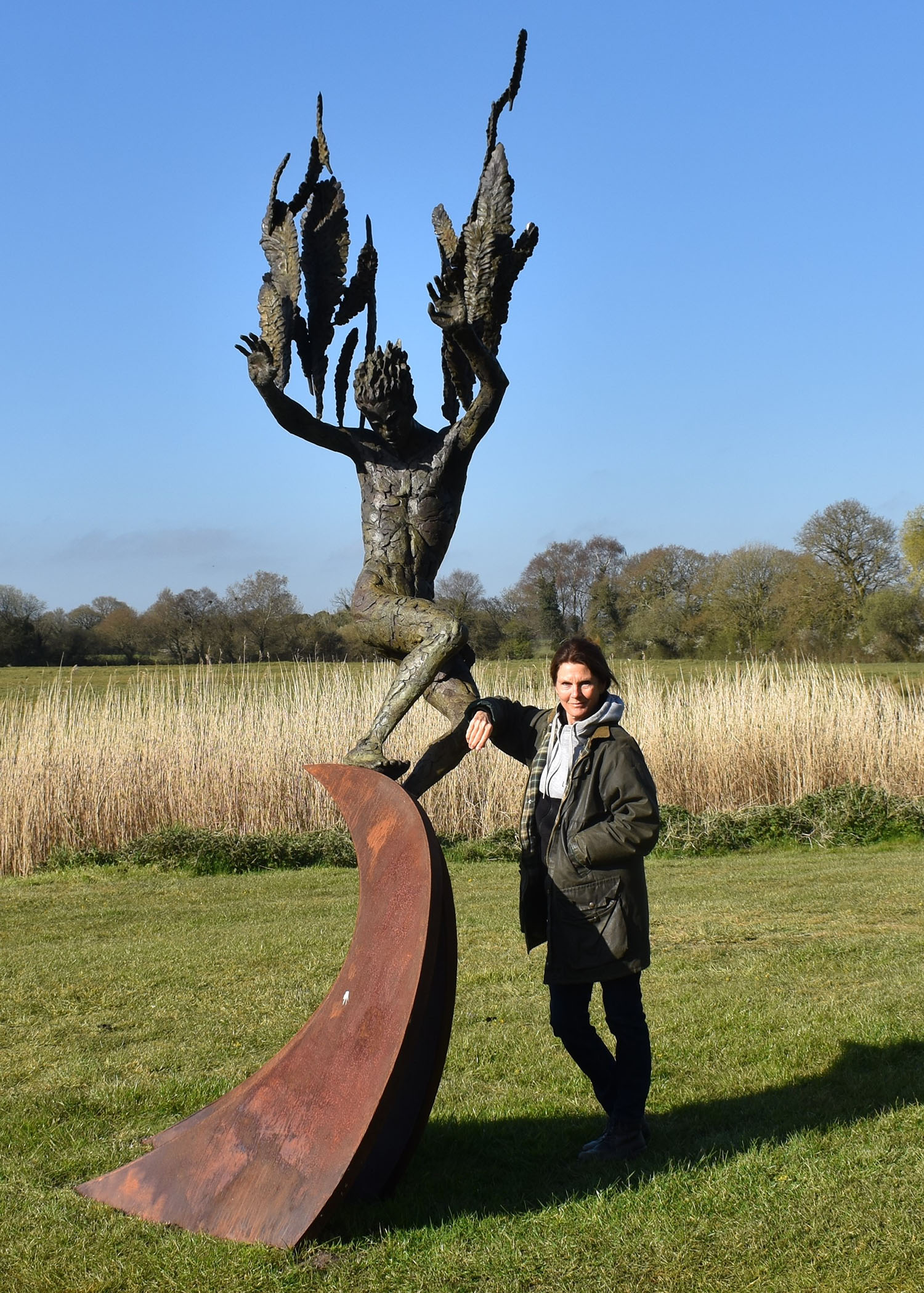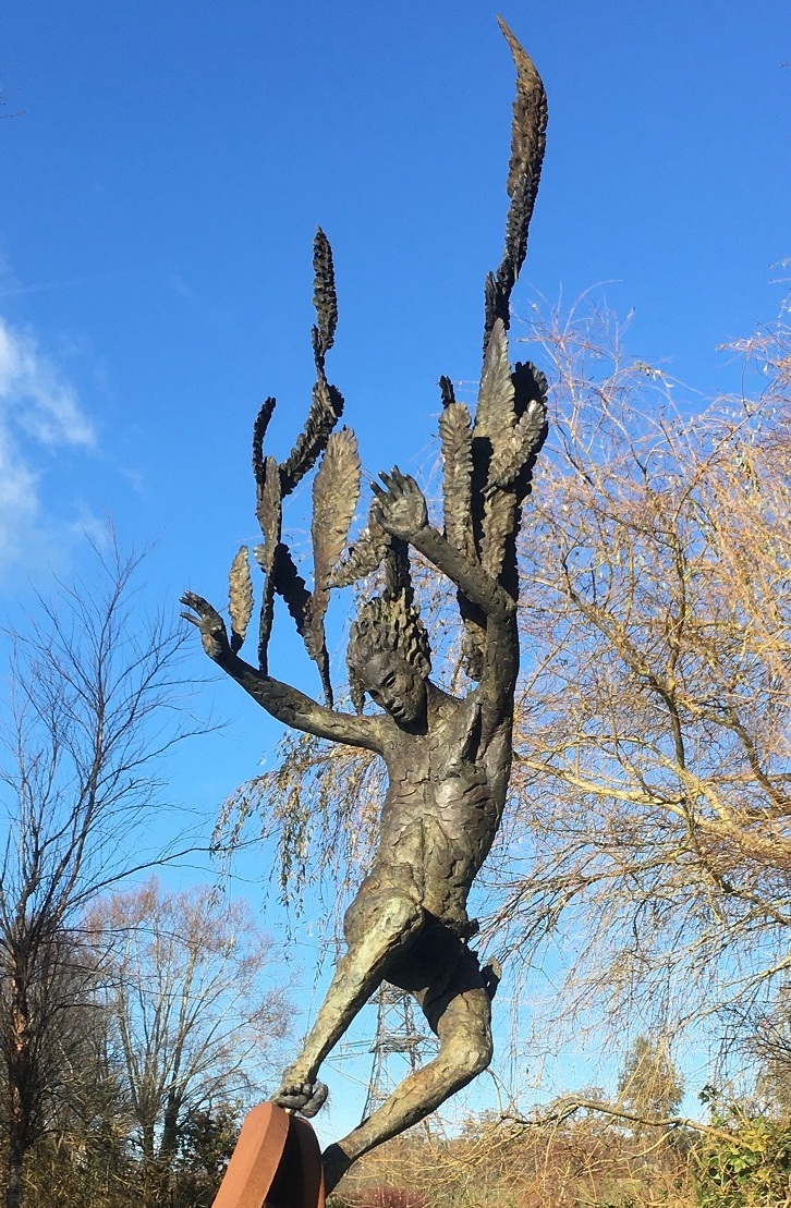 Nicola: Going back to my childhood, because I lived in countries like Kenya and Cyprus and Singapore, they were just amazing places, and there was always lots of sunlight and lots of sky, lots of space. And I, for some reason, had always wanted to fly. I didn’t really realise that, but there was that feeling of…yeah, I just wanted to learn how to fly. And it wasn’t until my 50th birthday that my husband gave me some flying lessons, and that just completely turned my head. And it was that, that…that’s when I started doing Icarus pieces, because I wanted to create that feeling of flying. And I think we were on holiday in Greece, and I said, “how do I make this work?” And then, of course, we talked about Greek mythology, and I thought, “oh, my God, I have him! I have him, you know, it’s Icarus!” And yeah, I just started working on my little Icarus figures, which then of course led to the one for the Olympics, which was extraordinary.